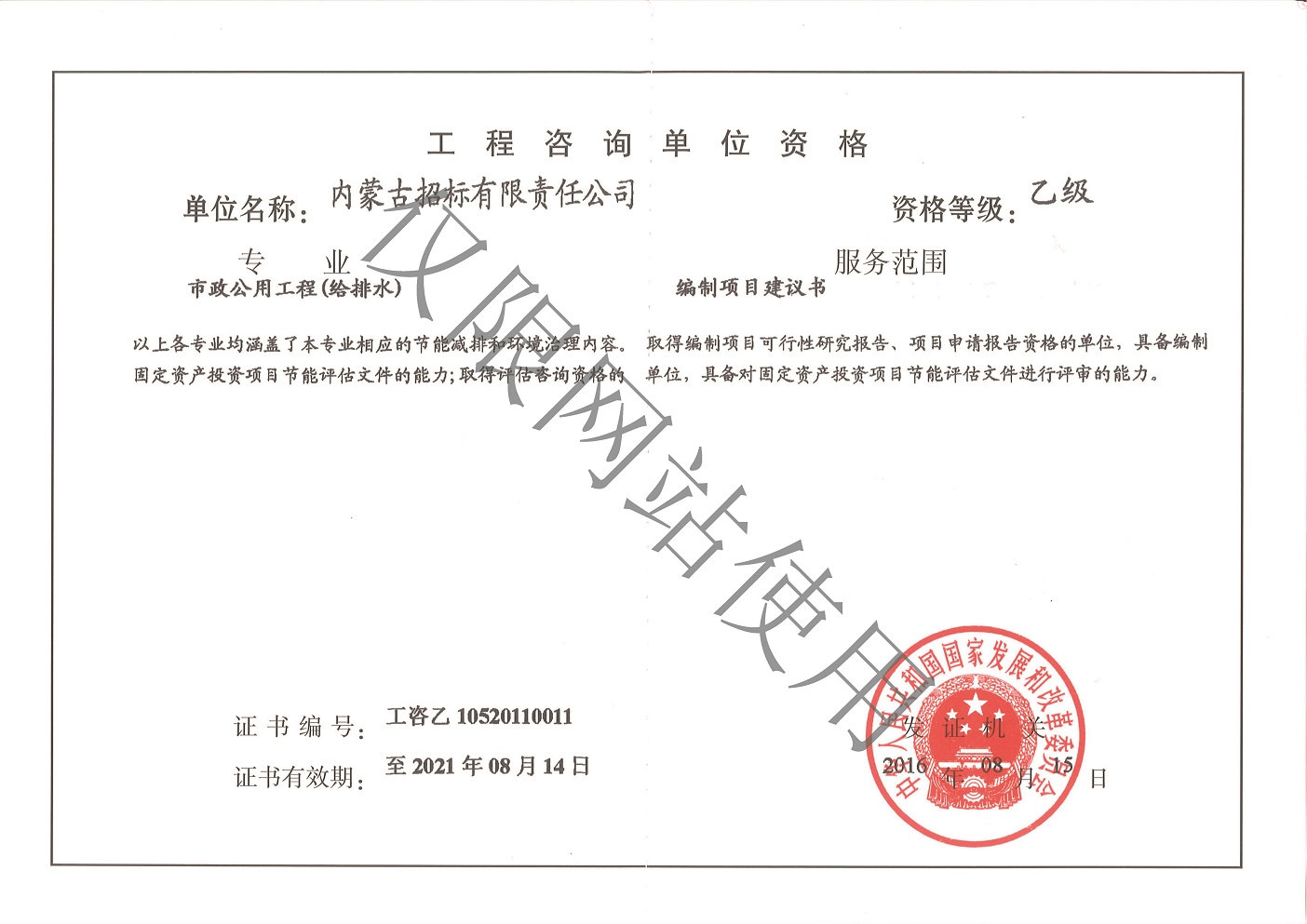 公司擁有中央投資項目招標代理機構甲級資質、政府采購代理機構甲級資質、國際招標機構甲級資質、工程招標代理機構甲級資質、軍工涉密業(yè)務咨詢服務安全保密條件備案證書、工程造價咨詢甲級資質、工程咨詢單位甲級資信、政府和社會資本合作(PPP)咨詢甲級資信、信息通信建設企業(yè)服務能力乙級證書、報關單位注冊登記證書、對外貿易經營者備案證書、出入境檢驗檢疫報檢企業(yè)備案證書、IS09001質量管理體系認證證書、ISO14001環(huán)境管理體系認證證書、OHSAS18001職業(yè)健康安全管理體系認證證書等資質證書。